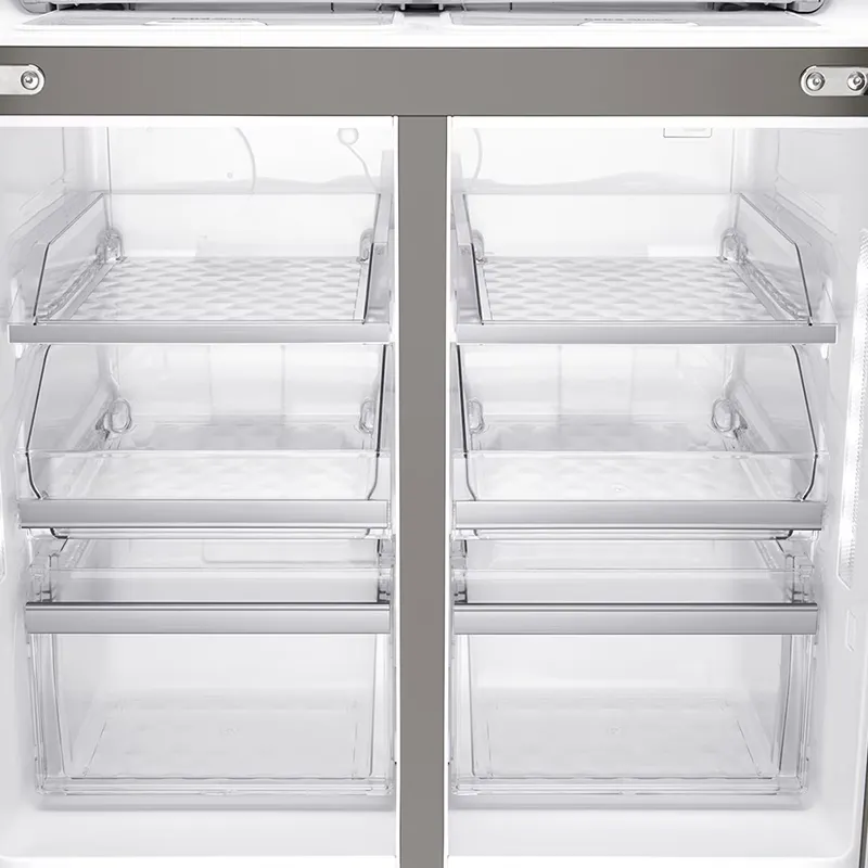 در بخش فریزر هم چیدمان حساب شده دیده می شود. چهار طبقه اصلی، شش طبقه روی درب و دو کشو عمیق فضای کافی برای بسته های منجمد ایجاد می کنند. باز شدن دو طرف درب، دسترسی به محتویات را راحت می کند. سیستم بدون برفک و امکان انجماد سریع، جریان هوای سالم و ثابت را فراهم می کند. یخساز اتوماتیک نیز بدون نیاز به دخالت دستی یخ حبه ای یا خرد تولید می کند.