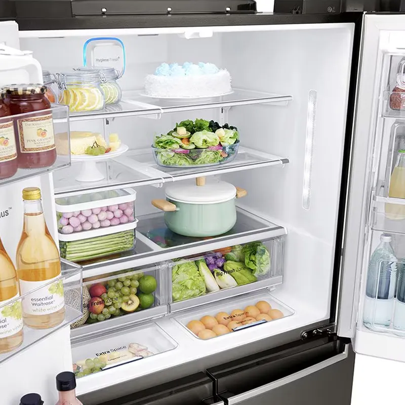 در بخش درب، شش طبقه قرار دارد. این طبقات برای بطری، نوشیدنی، سس ها و اقلام سبک تر مناسب است. هر طبقه عمق کافی دارد تا هنگام باز و بسته شدن درب، ثبات محتویات حفظ شود. بخش کشوها در پایین قرار گرفته است. دو کشو با عمق مناسب طراحی شده اند. یکی از آنها قابلیت تنظیم دما و رطوبت دارد و همین ویژگی نگهداری میوه و سبزی را ساده تر می کند. ترکیب این کشو با امکان LINEARCooling طراوت مواد غذایی را برای چند روز حفظ می کند.